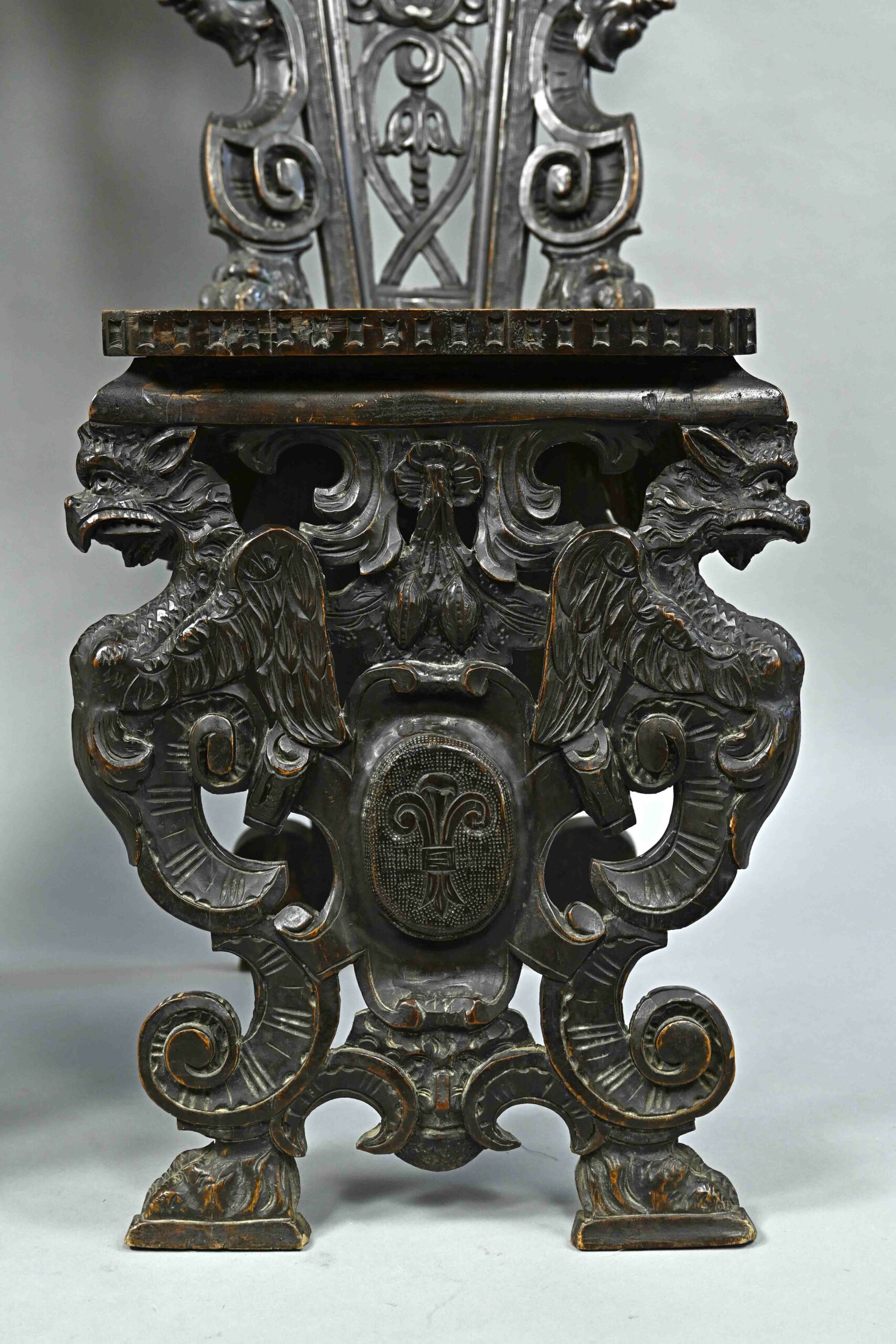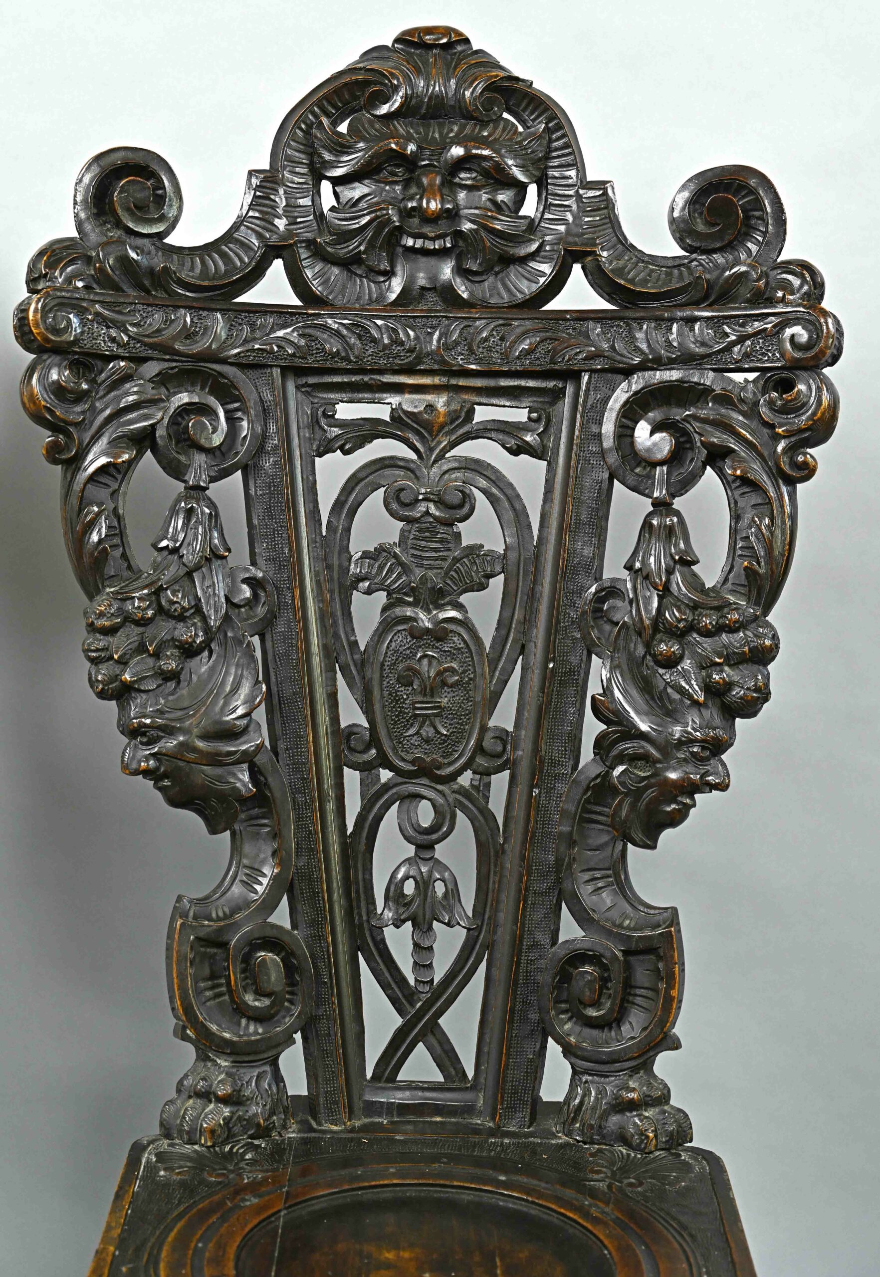 Die Stühle sind reich geschnitzt, verziert mit Putti, Satyr, Löwenköpfe und Blattwerk, vertiefter Sitz, durchbrochene Wangenbeine, Rücklehne mit Durchbrucharbeit.