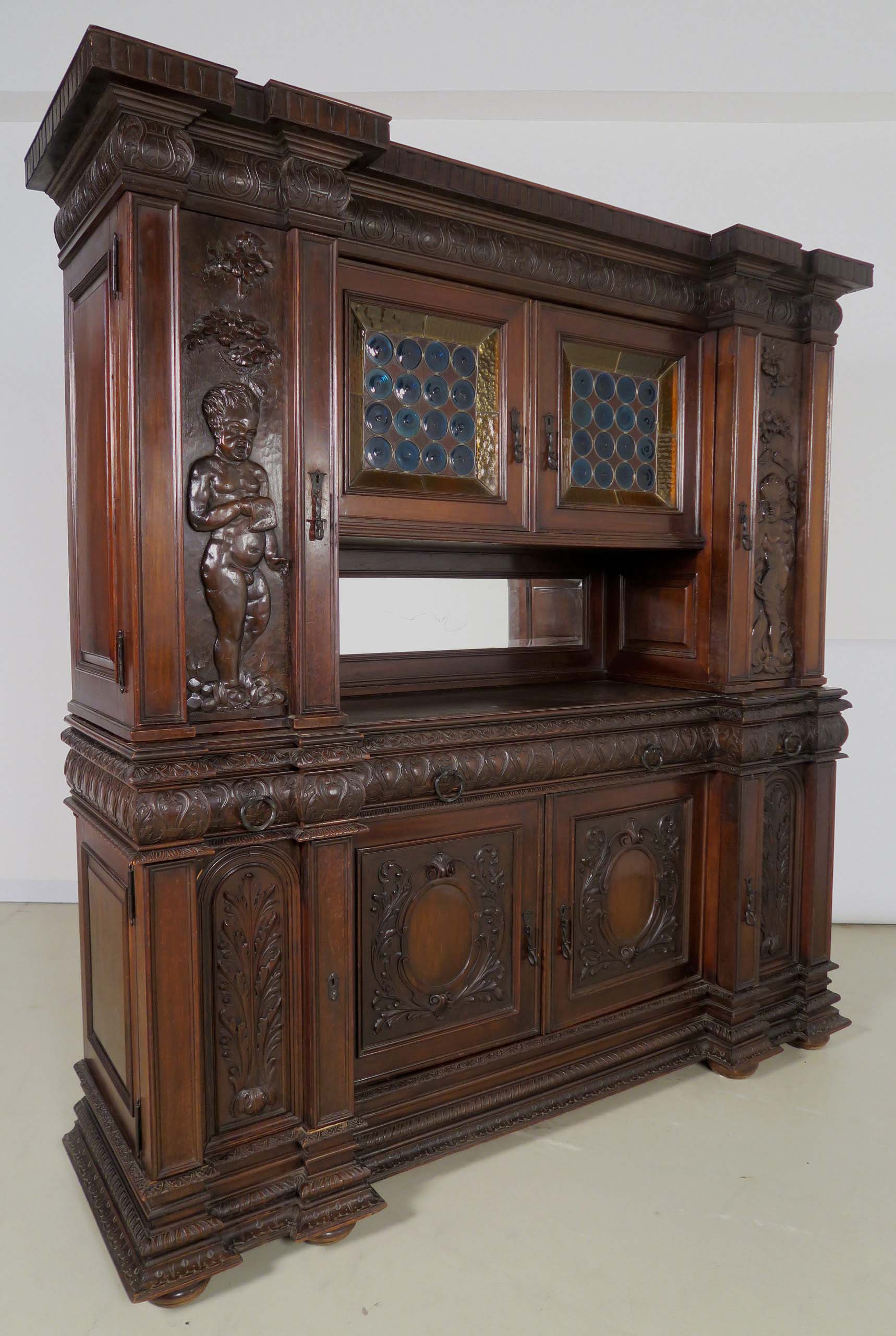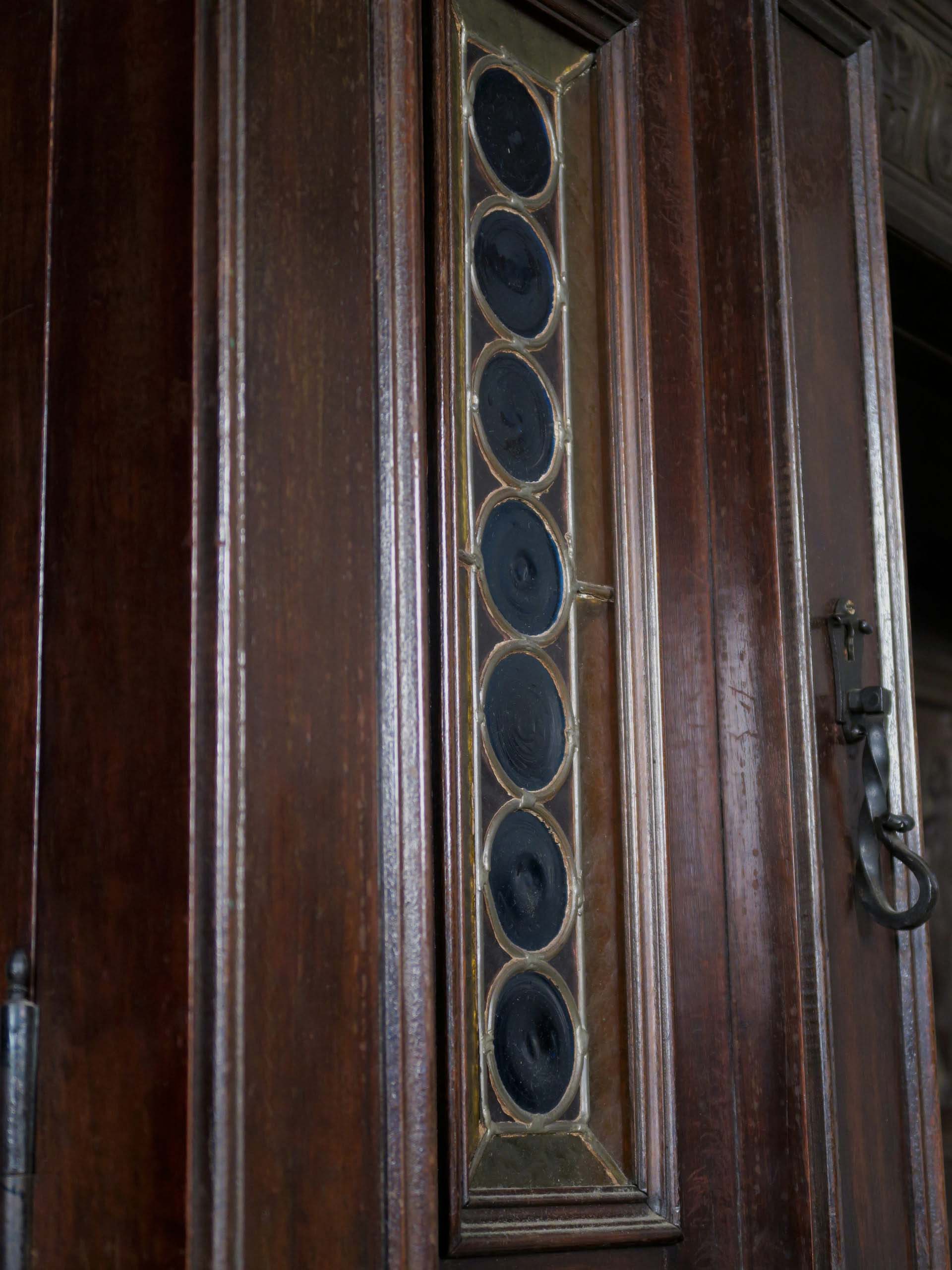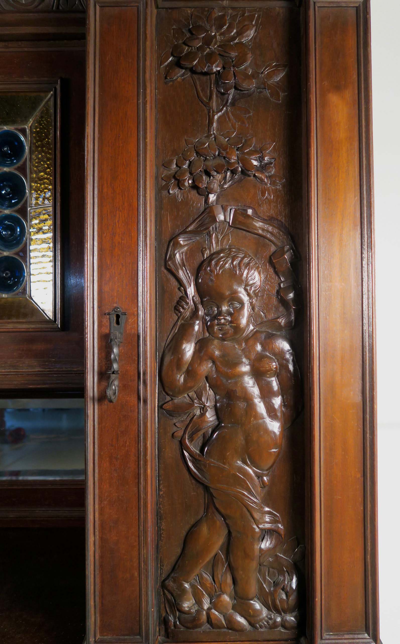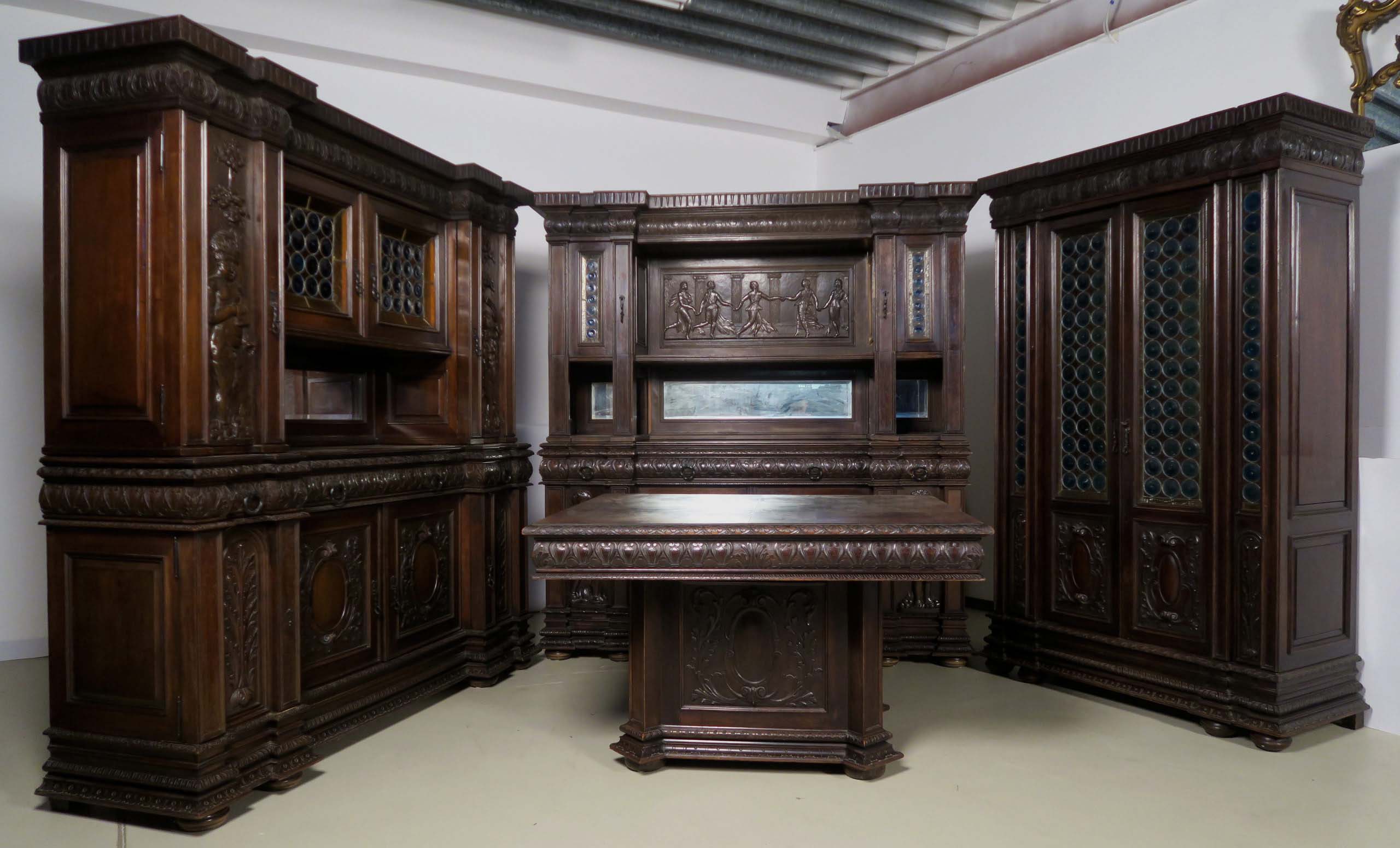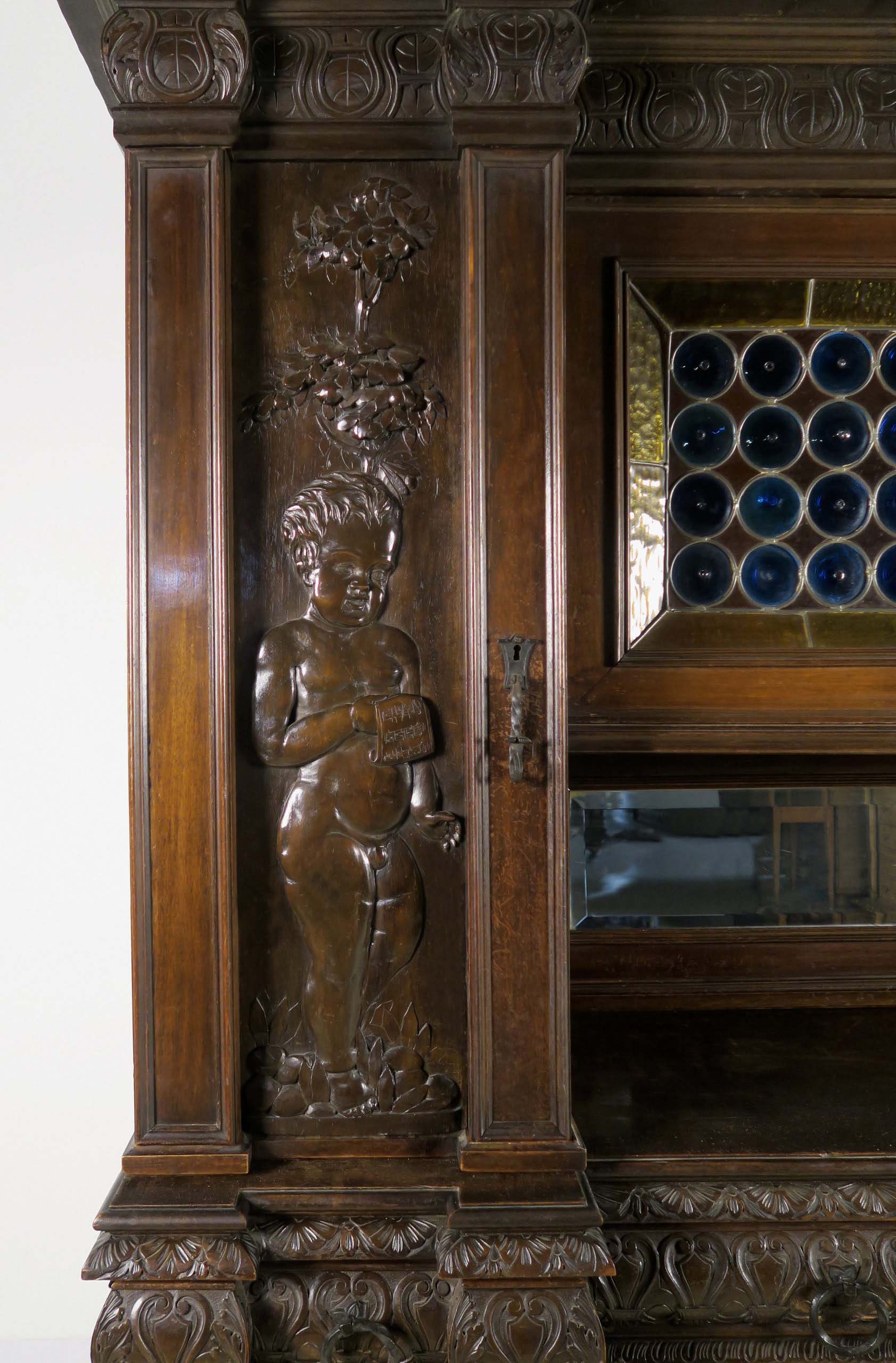 Die drei Schrankmöbel begeistern unter anderem durch ihre zauberhafte Schnitzkunst in Form filigran gestalteter Engelsfiguren in den seitlichen Türmen, die kleinere Anrichte zeigt ein außergewöhnliches Relief mit fünf tanzenden Personen. Weiterhin werden die Möbel von verspielter floraler Ornamentik und kunstvollen geometrischen Figuren geschmückt. Die Zargen und Gesimse sind von aufwändigen Friesen gesäumt, die Seiten komplett kassettiert. Ein weiteres Highlight bilden die unglaublichen Bleiverglasungen, besonders stechen hier die Türen des Bücherschranks hervor. Das tiefe Blau der Kreise korrespondiert dabei sehr stilvoll mit den gelblichen Einrahmungen.