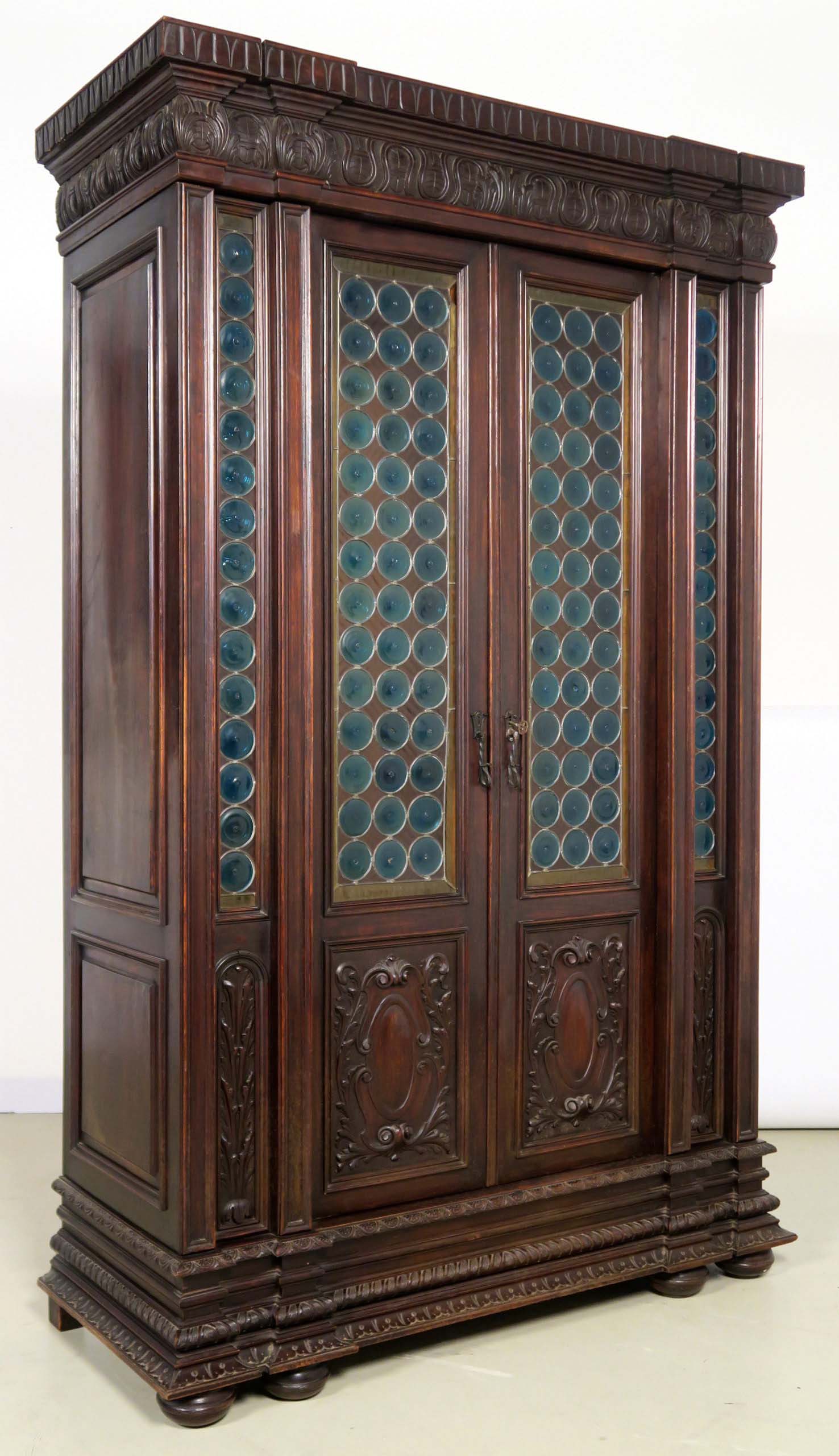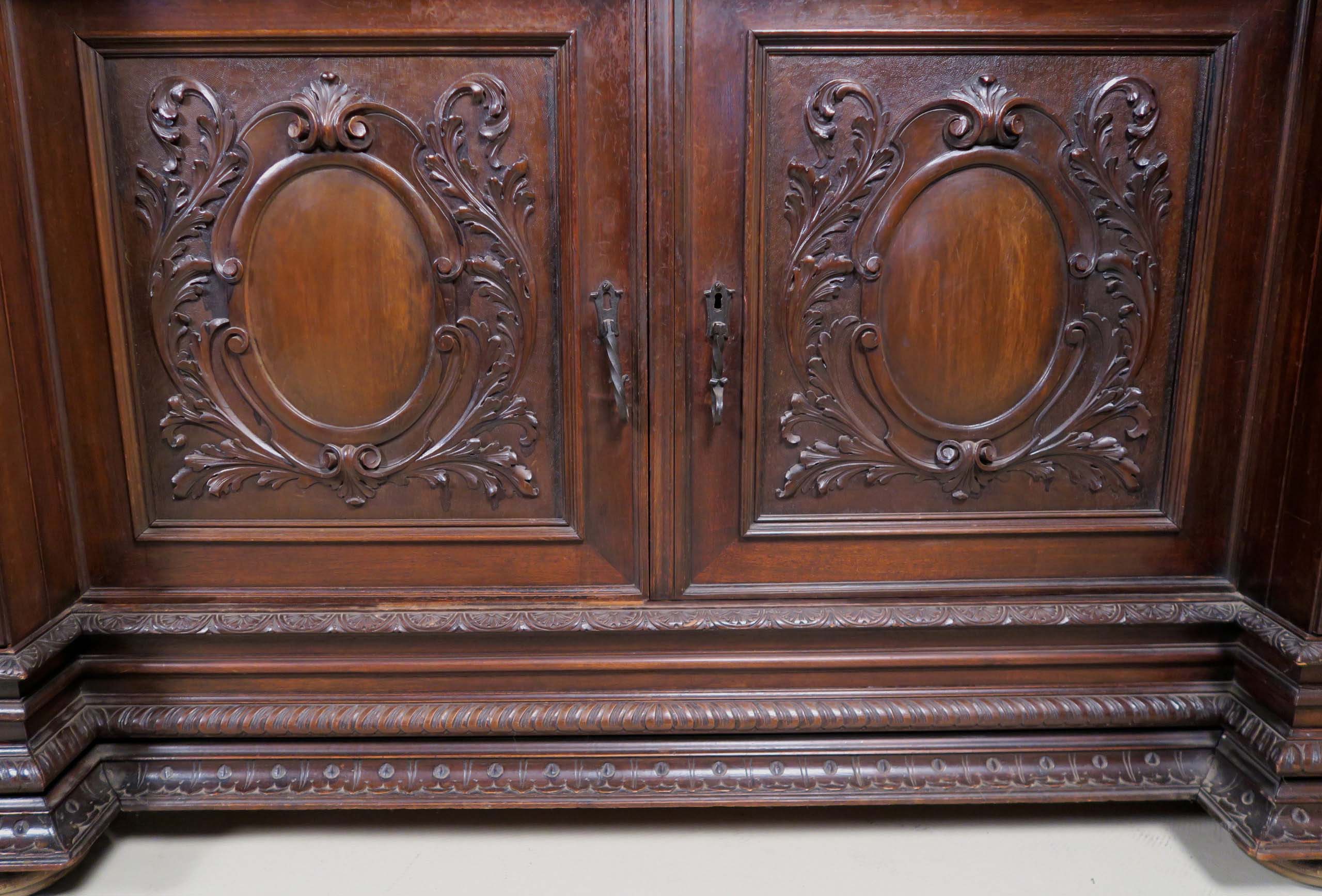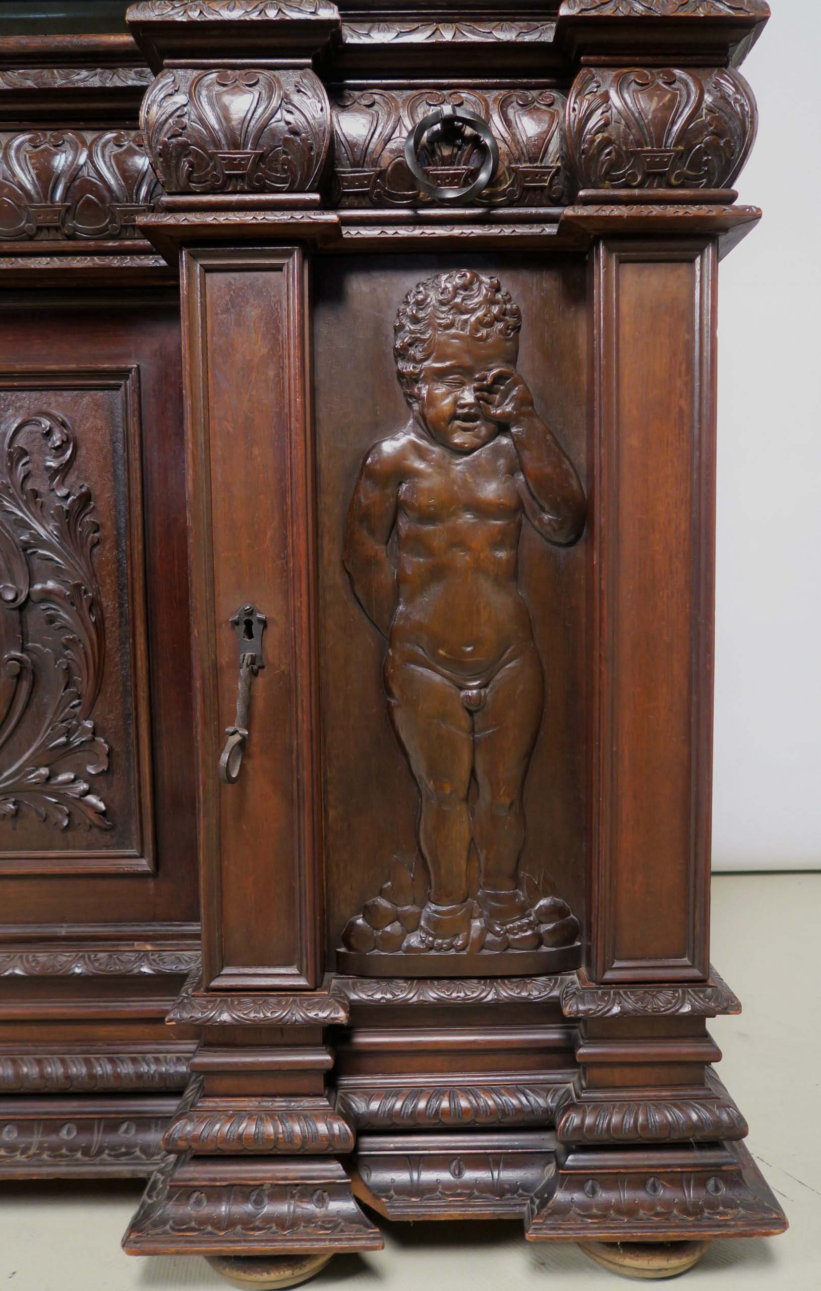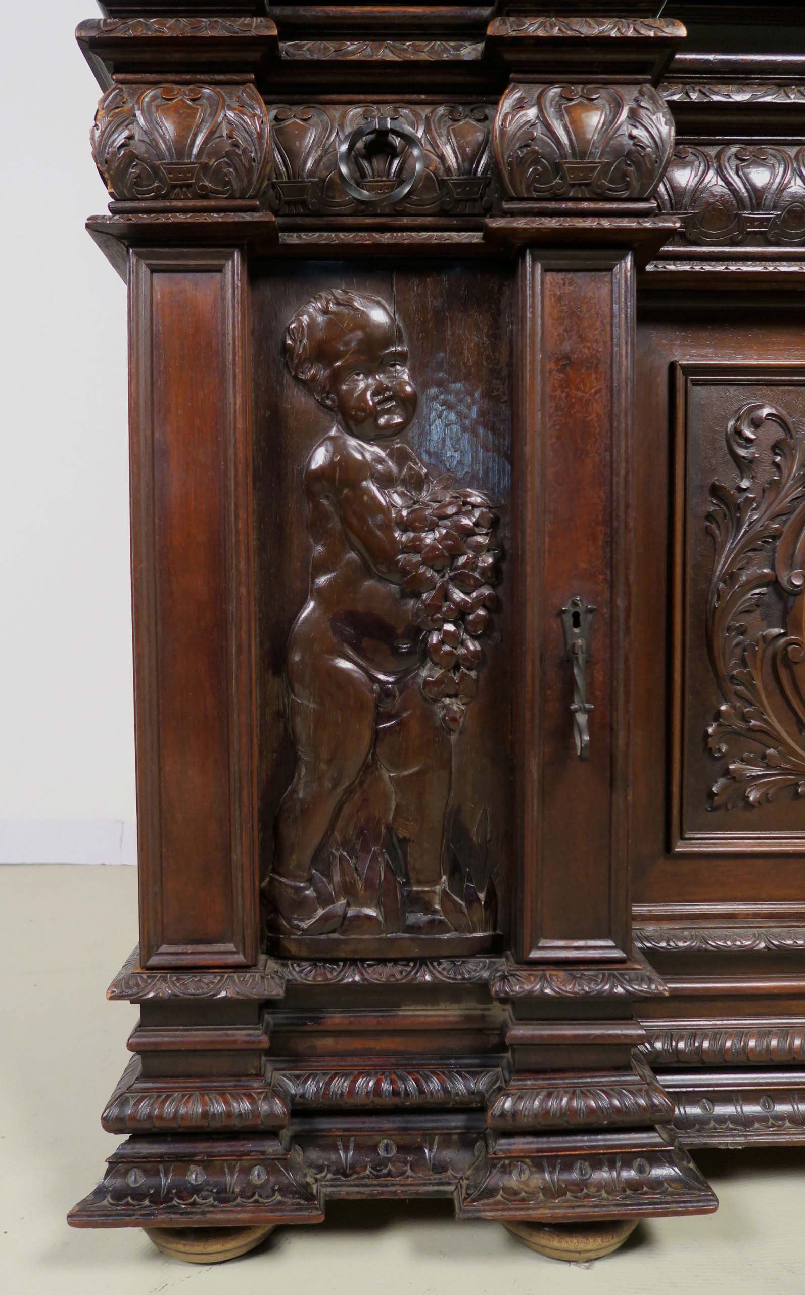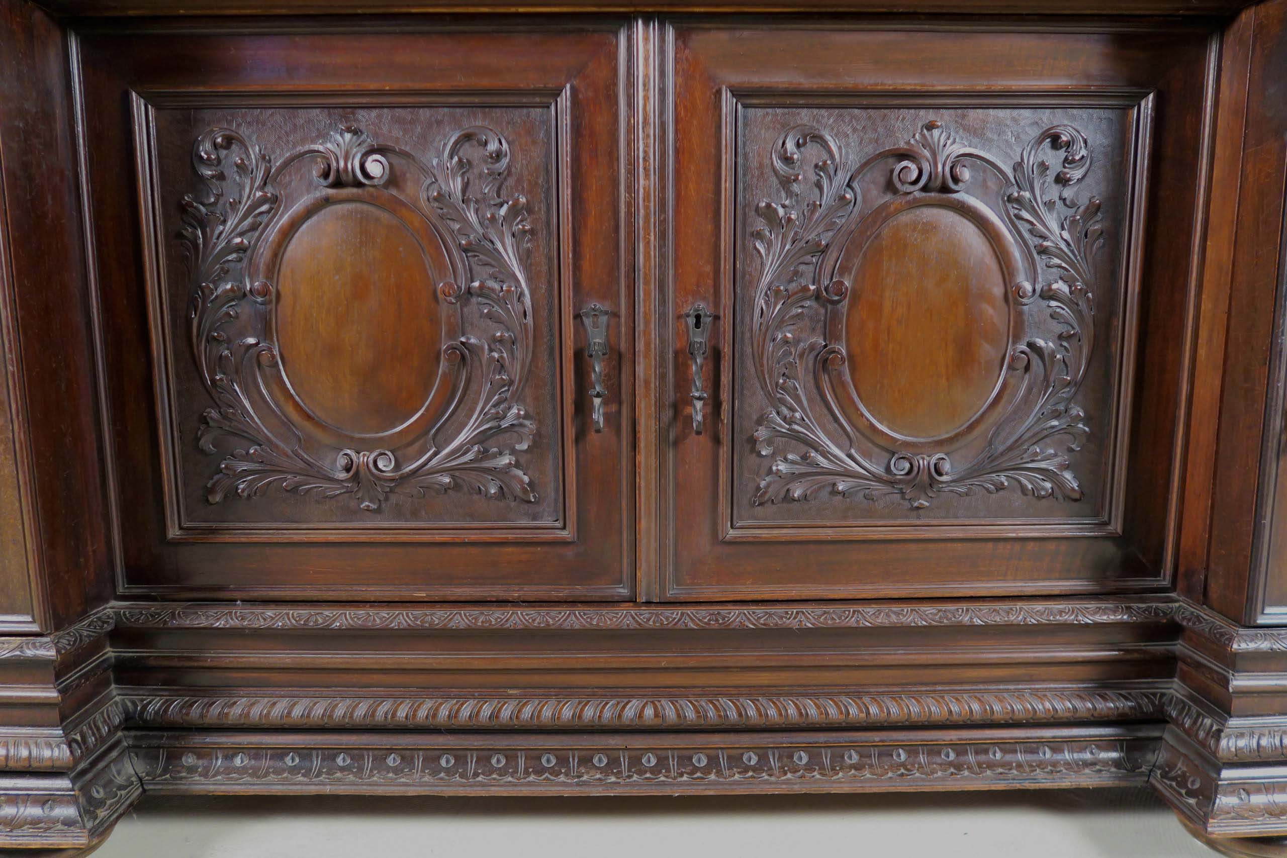 Die drei Schrankmöbel begeistern unter anderem durch ihre zauberhafte Schnitzkunst in Form filigran gestalteter Engelsfiguren in den seitlichen Türmen, die kleinere Anrichte zeigt ein außergewöhnliches Relief mit fünf tanzenden Personen. Weiterhin werden die Möbel von verspielter floraler Ornamentik und kunstvollen geometrischen Figuren geschmückt. Die Zargen und Gesimse sind von aufwändigen Friesen gesäumt, die Seiten komplett kassettiert. Ein weiteres Highlight bilden die unglaublichen Bleiverglasungen, besonders stechen hier die Türen des Bücherschranks hervor. Das tiefe Blau der Kreise korrespondiert dabei sehr stilvoll mit den gelblichen Einrahmungen.