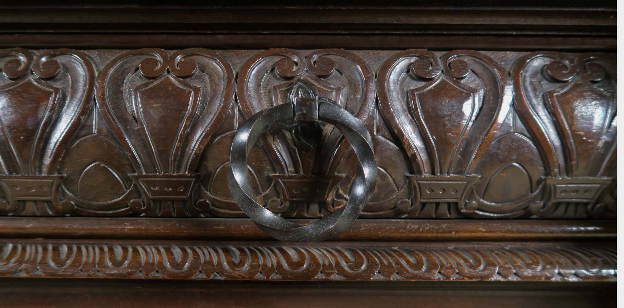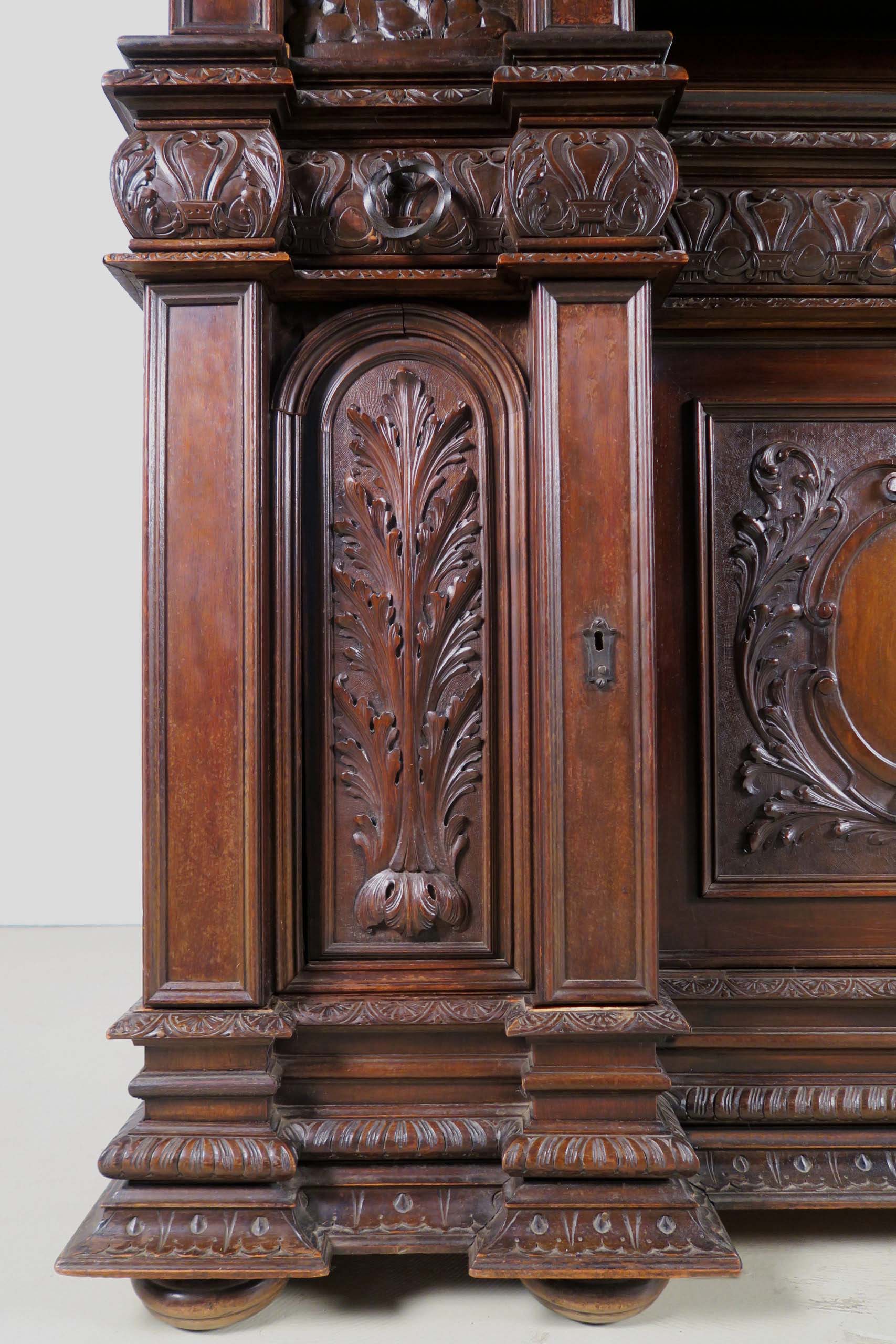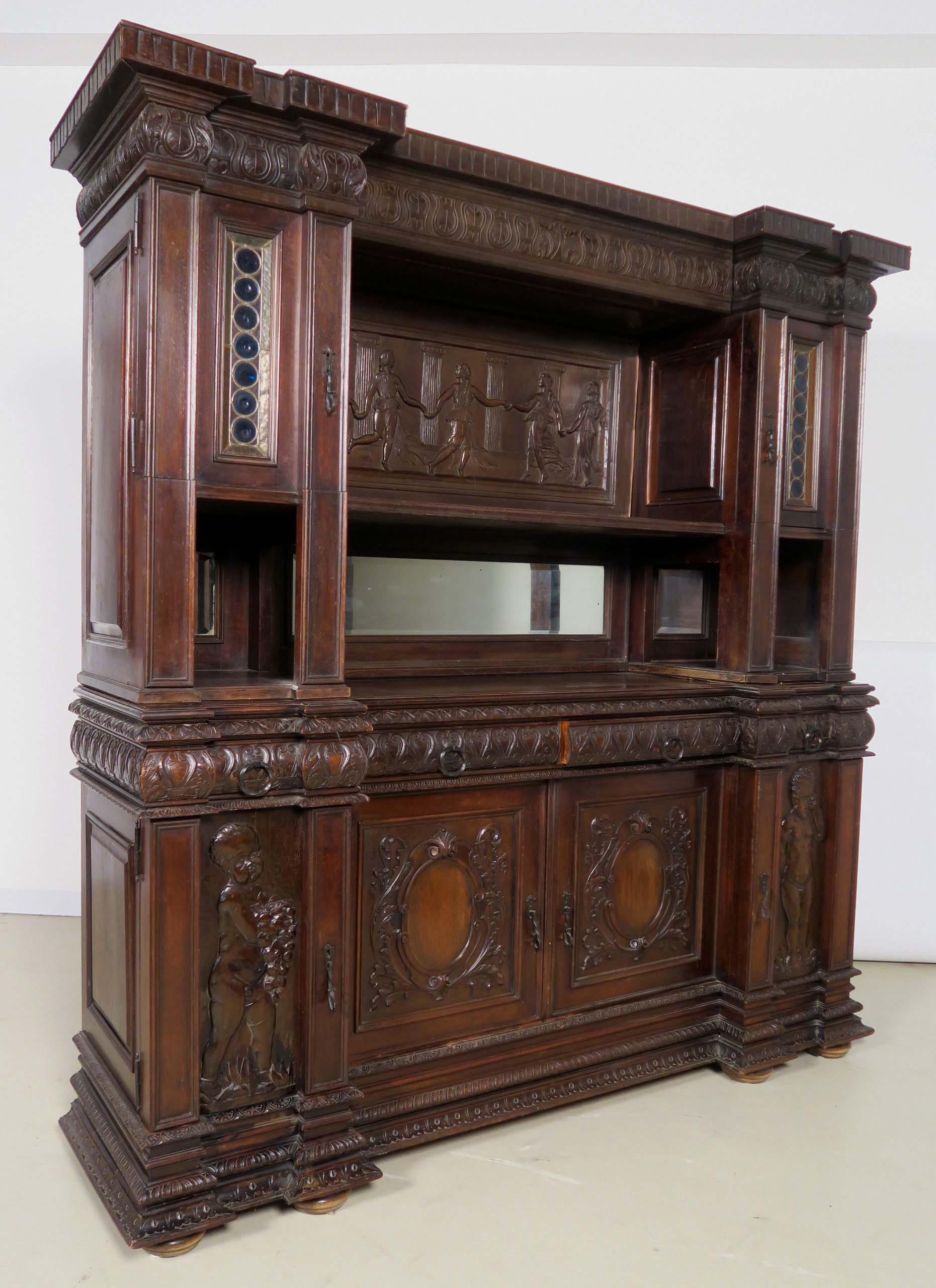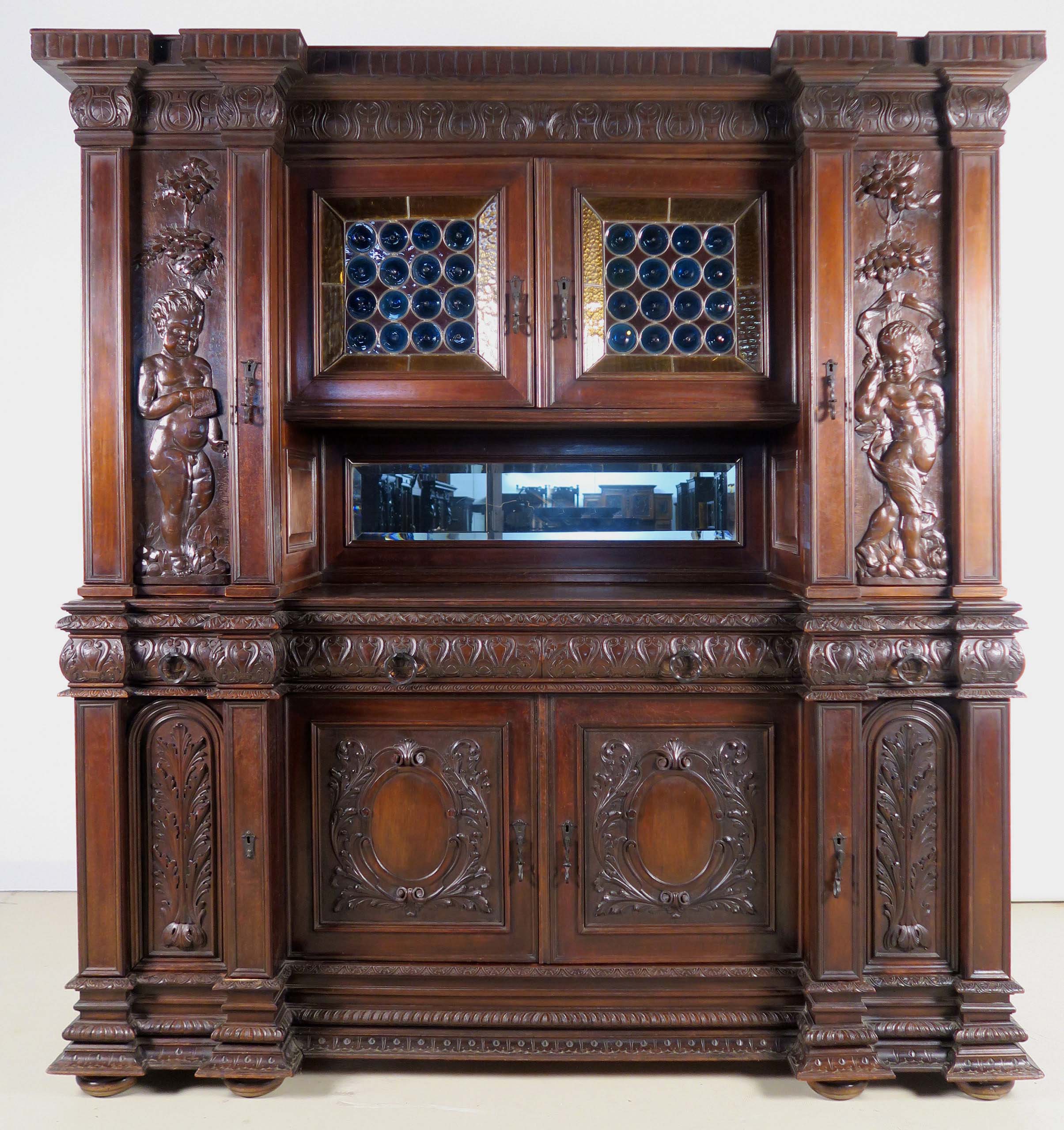 Die drei Schrankmöbel begeistern unter anderem durch ihre zauberhafte Schnitzkunst in Form filigran gestalteter Engelsfiguren in den seitlichen Türmen, die kleinere Anrichte zeigt ein außergewöhnliches Relief mit fünf tanzenden Personen. Weiterhin werden die Möbel von verspielter floraler Ornamentik und kunstvollen geometrischen Figuren geschmückt. Die Zargen und Gesimse sind von aufwändigen Friesen gesäumt, die Seiten komplett kassettiert. Ein weiteres Highlight bilden die unglaublichen Bleiverglasungen, besonders stechen hier die Türen des Bücherschranks hervor. Das tiefe Blau der Kreise korrespondiert dabei sehr stilvoll mit den gelblichen Einrahmungen.