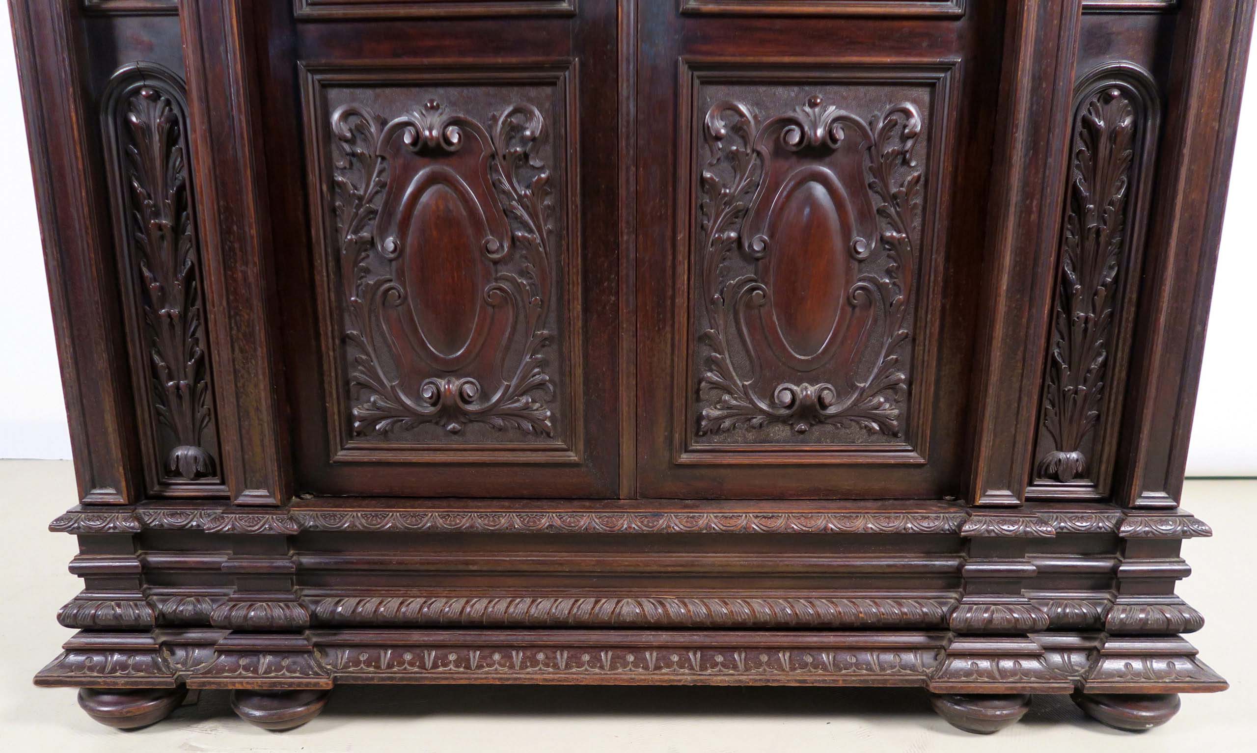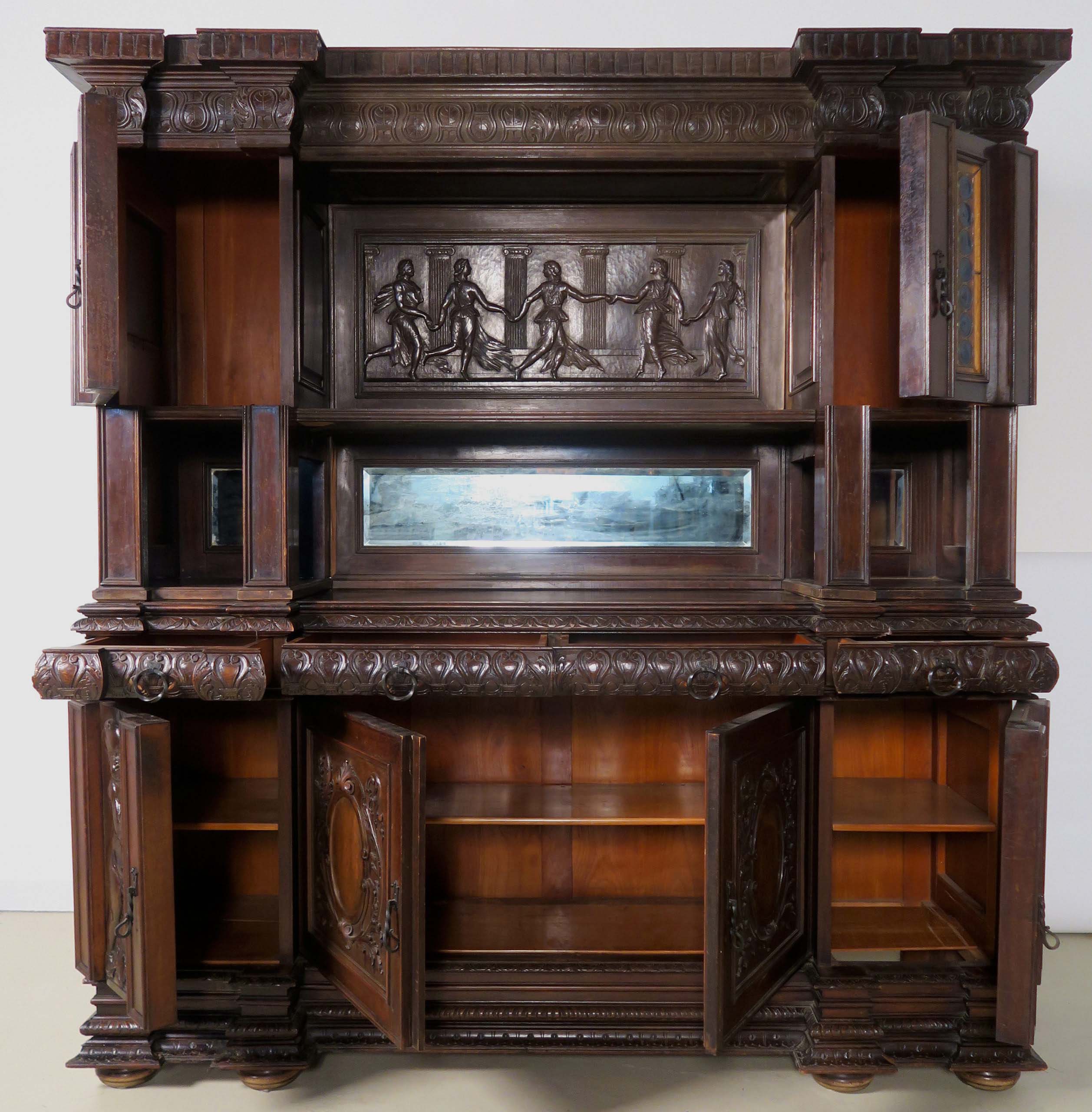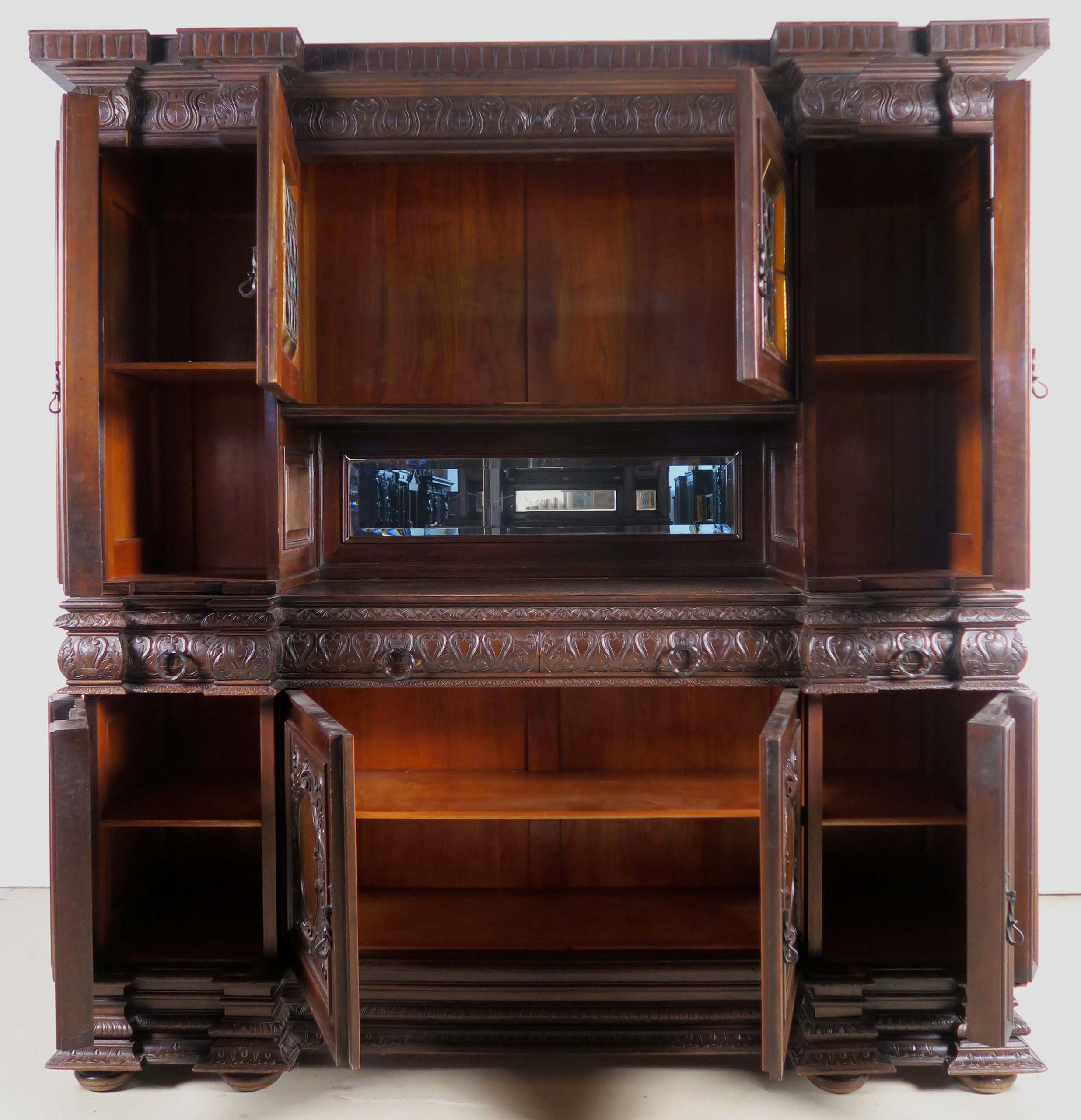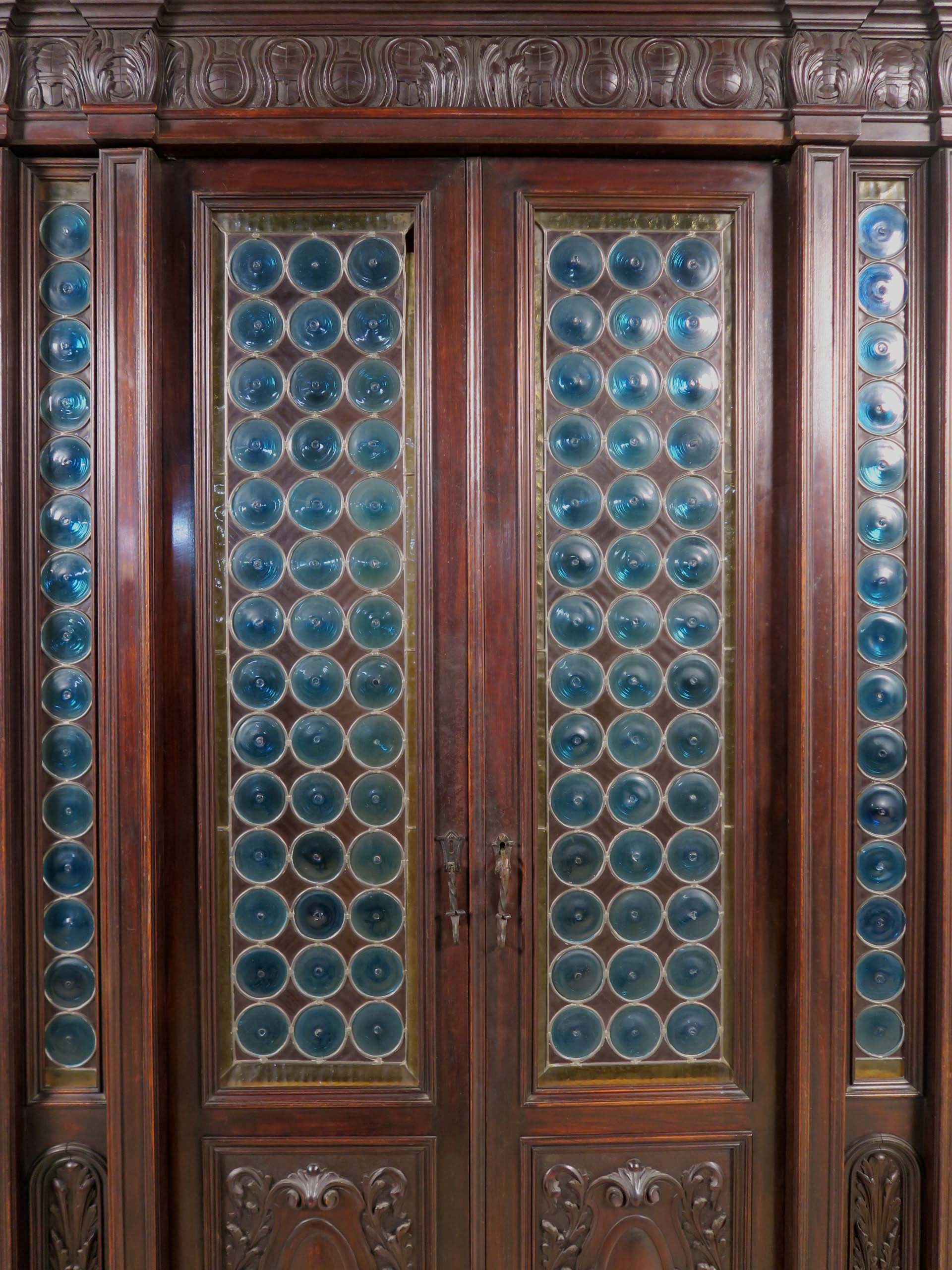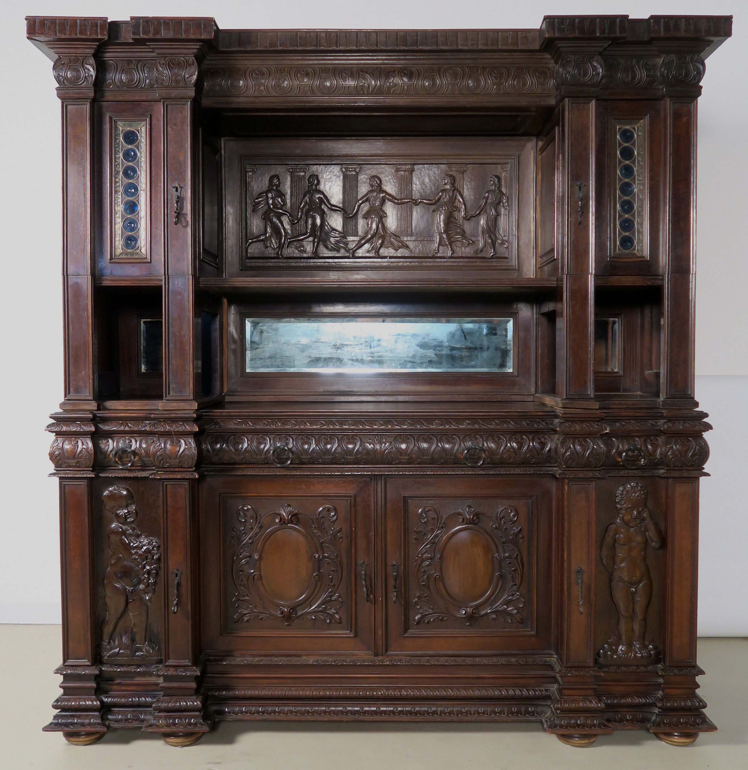 Die drei Schrankmöbel begeistern unter anderem durch ihre zauberhafte Schnitzkunst in Form filigran gestalteter Engelsfiguren in den seitlichen Türmen, die kleinere Anrichte zeigt ein außergewöhnliches Relief mit fünf tanzenden Personen. Weiterhin werden die Möbel von verspielter floraler Ornamentik und kunstvollen geometrischen Figuren geschmückt. Die Zargen und Gesimse sind von aufwändigen Friesen gesäumt, die Seiten komplett kassettiert. Ein weiteres Highlight bilden die unglaublichen Bleiverglasungen, besonders stechen hier die Türen des Bücherschranks hervor. Das tiefe Blau der Kreise korrespondiert dabei sehr stilvoll mit den gelblichen Einrahmungen.