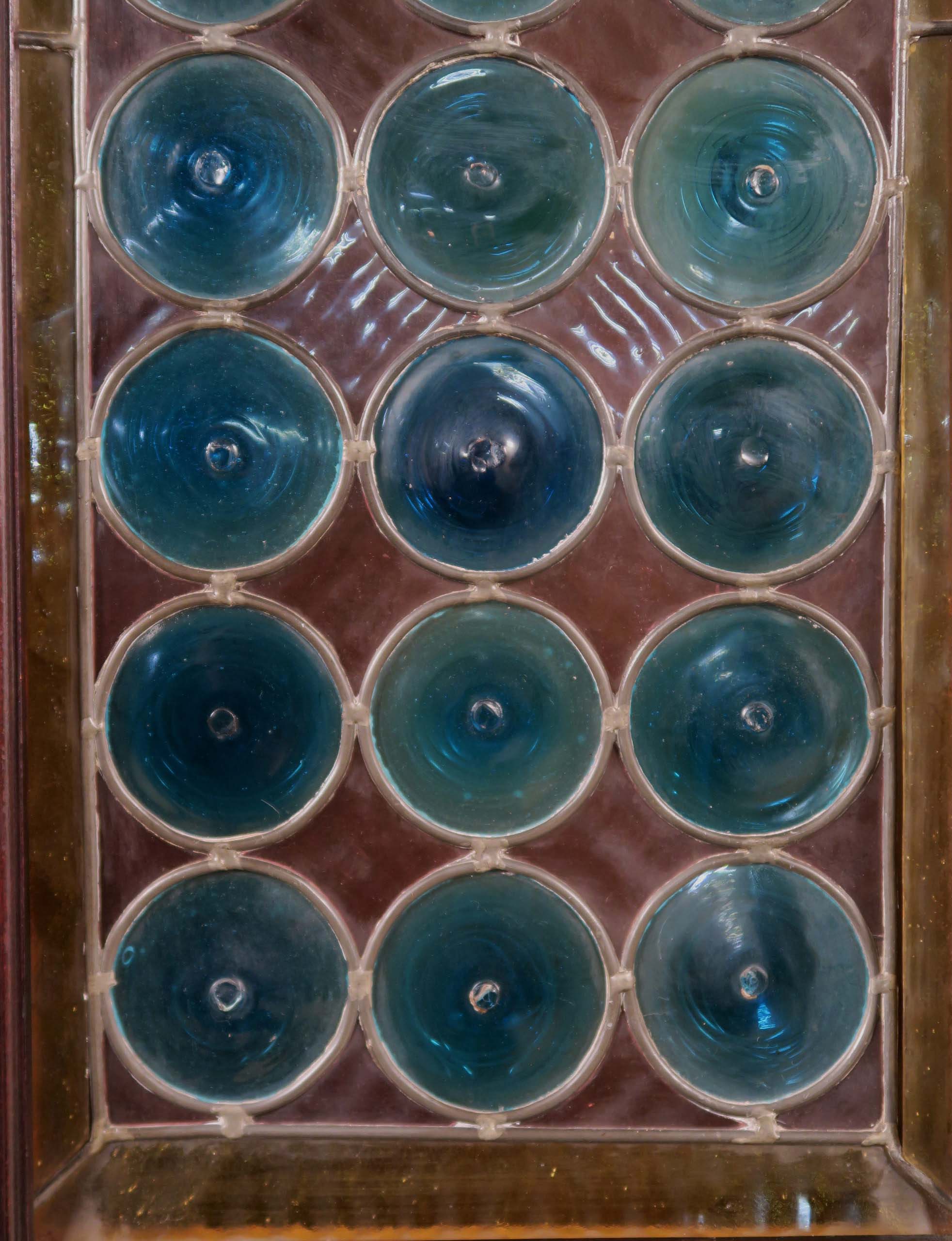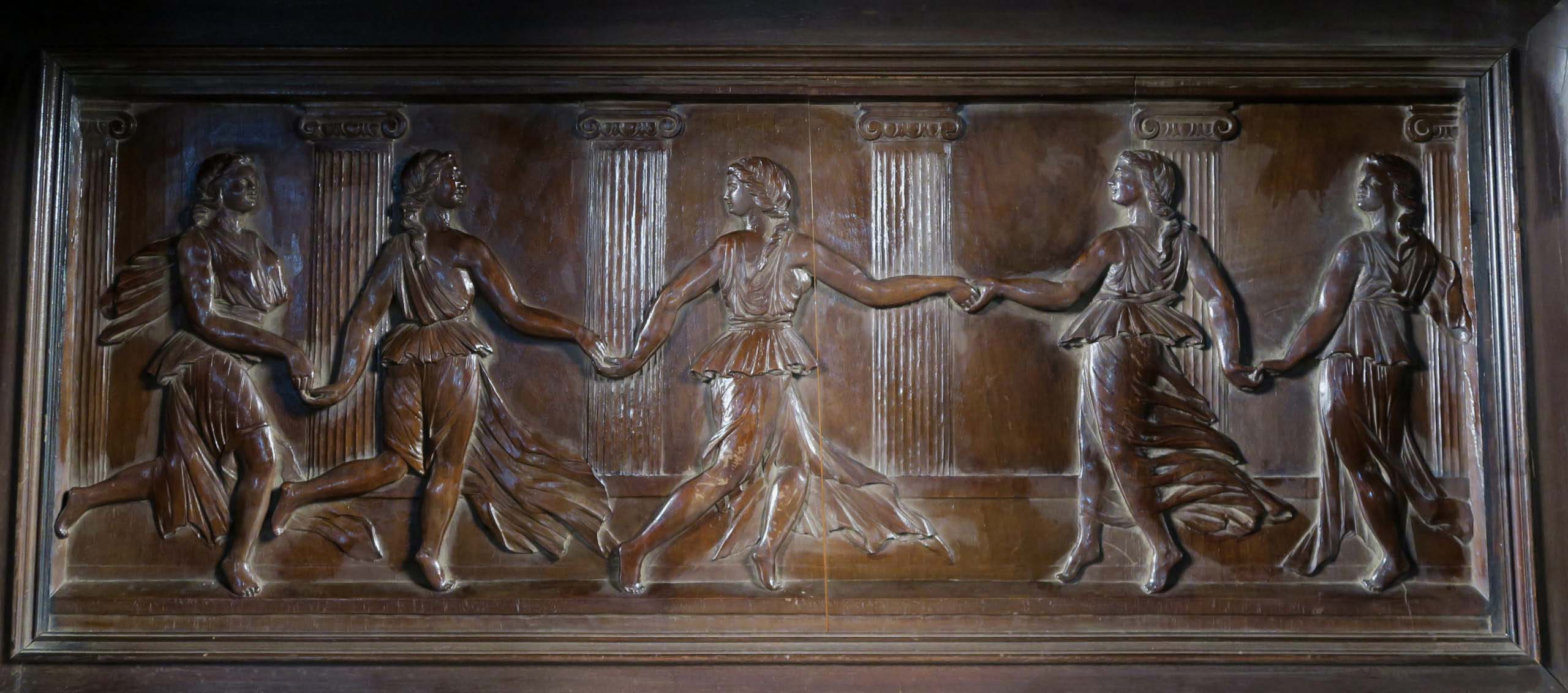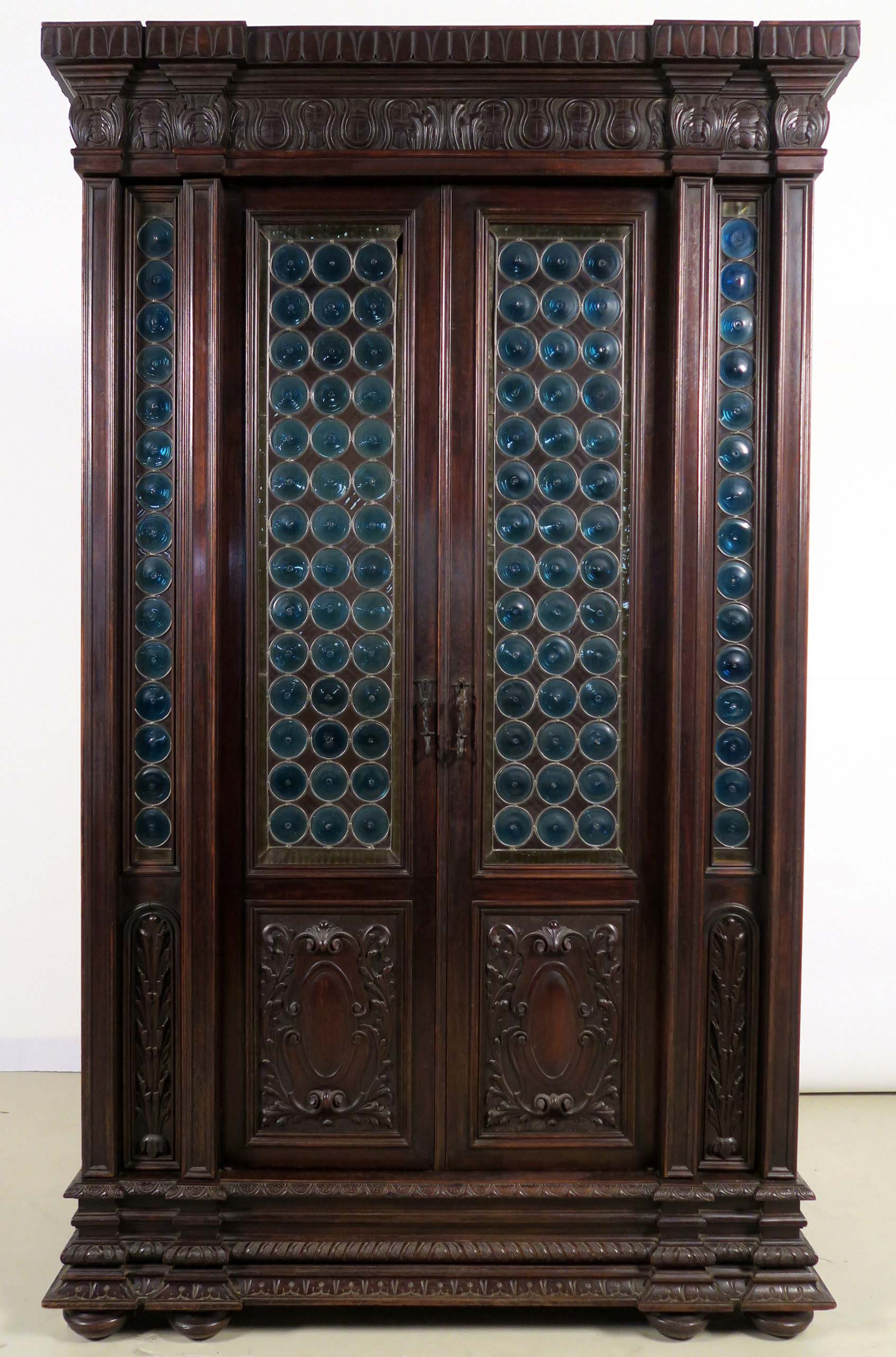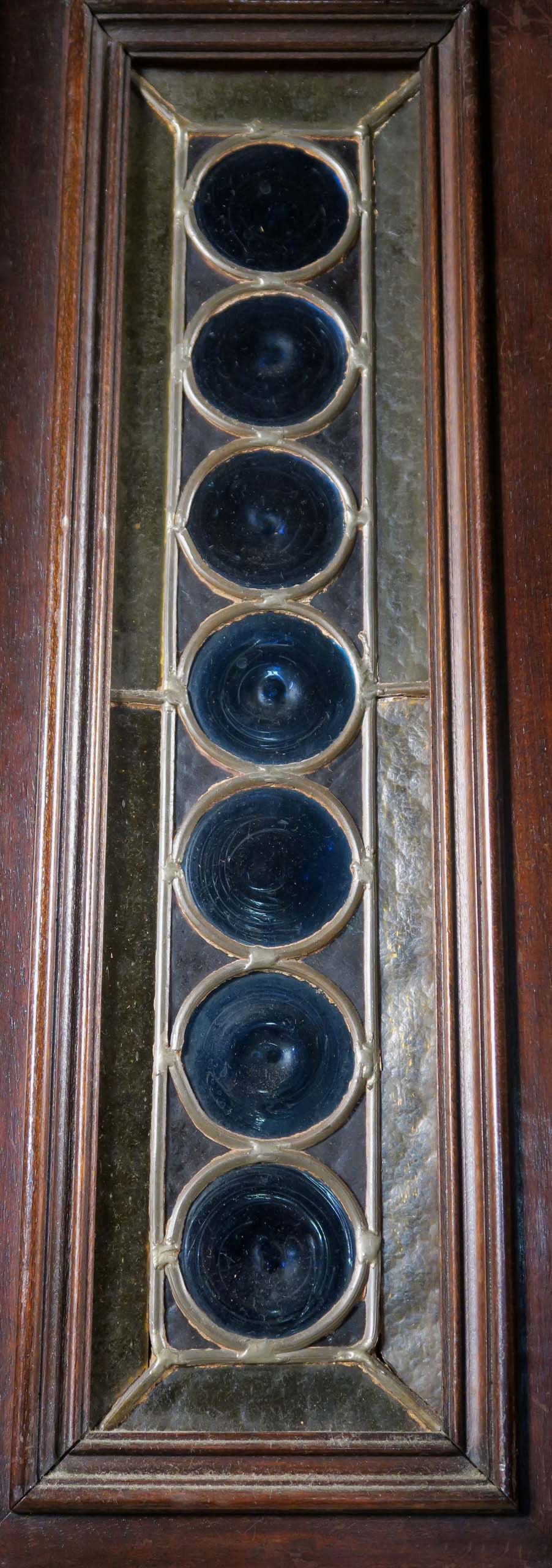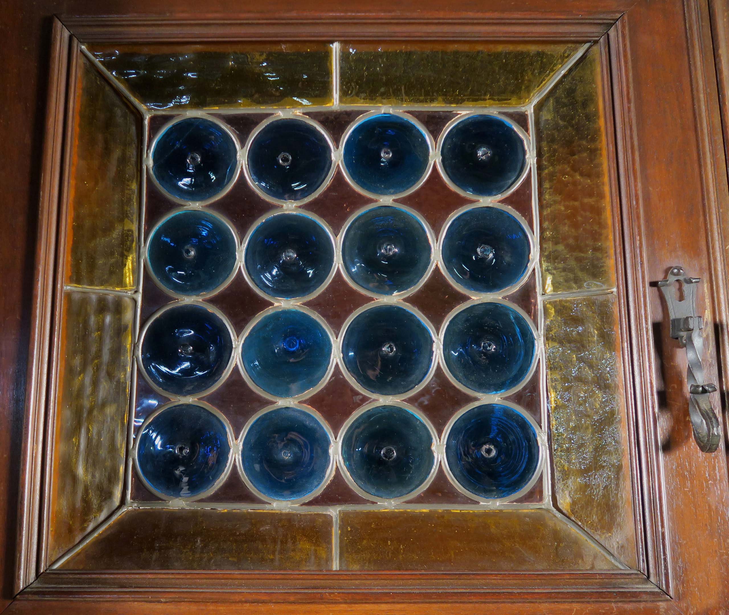 Die drei Schrankmöbel begeistern unter anderem durch ihre zauberhafte Schnitzkunst in Form filigran gestalteter Engelsfiguren in den seitlichen Türmen, die kleinere Anrichte zeigt ein außergewöhnliches Relief mit fünf tanzenden Personen. Weiterhin werden die Möbel von verspielter floraler Ornamentik und kunstvollen geometrischen Figuren geschmückt. Die Zargen und Gesimse sind von aufwändigen Friesen gesäumt, die Seiten komplett kassettiert. Ein weiteres Highlight bilden die unglaublichen Bleiverglasungen, besonders stechen hier die Türen des Bücherschranks hervor. Das tiefe Blau der Kreise korrespondiert dabei sehr stilvoll mit den gelblichen Einrahmungen.