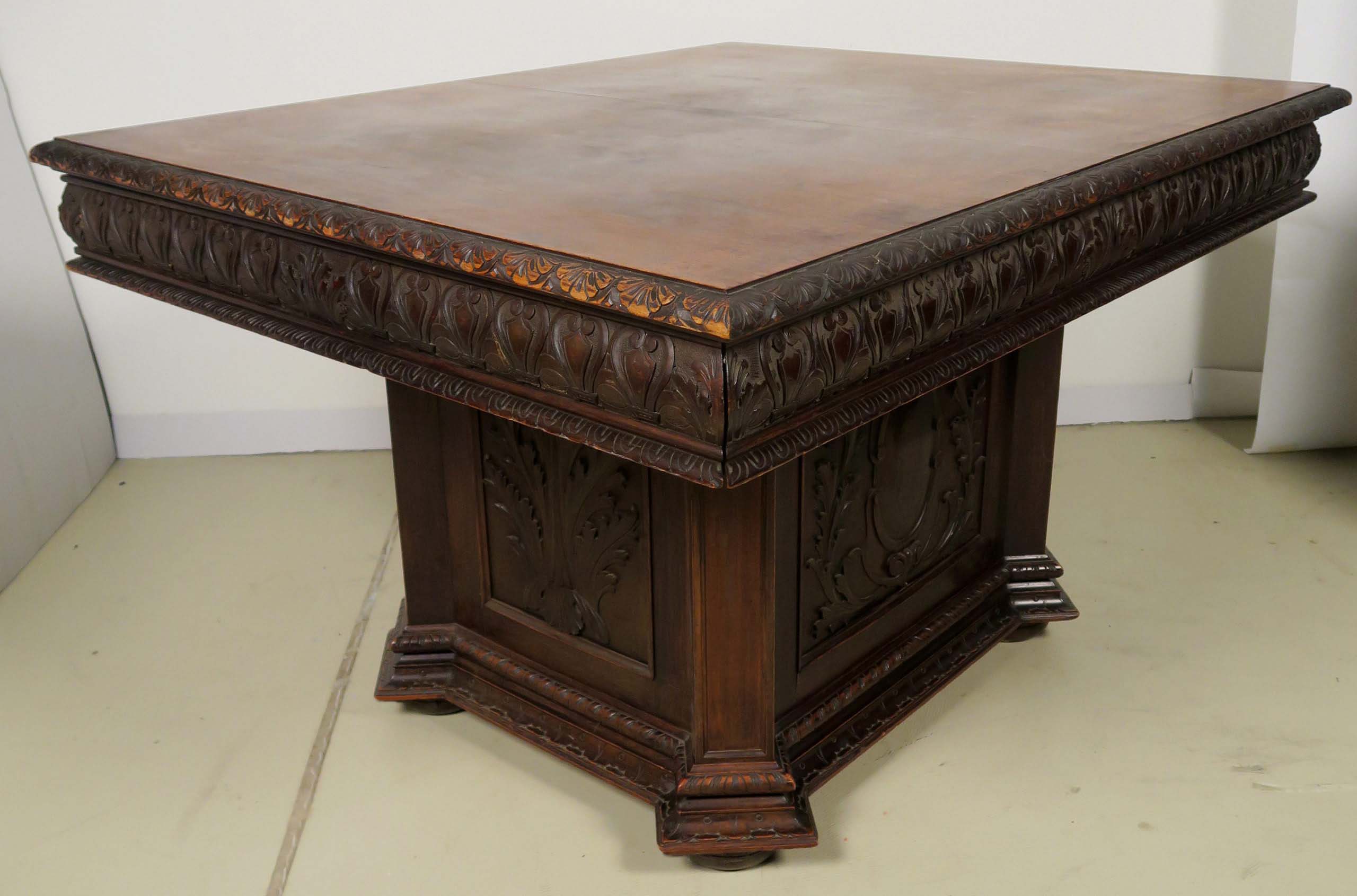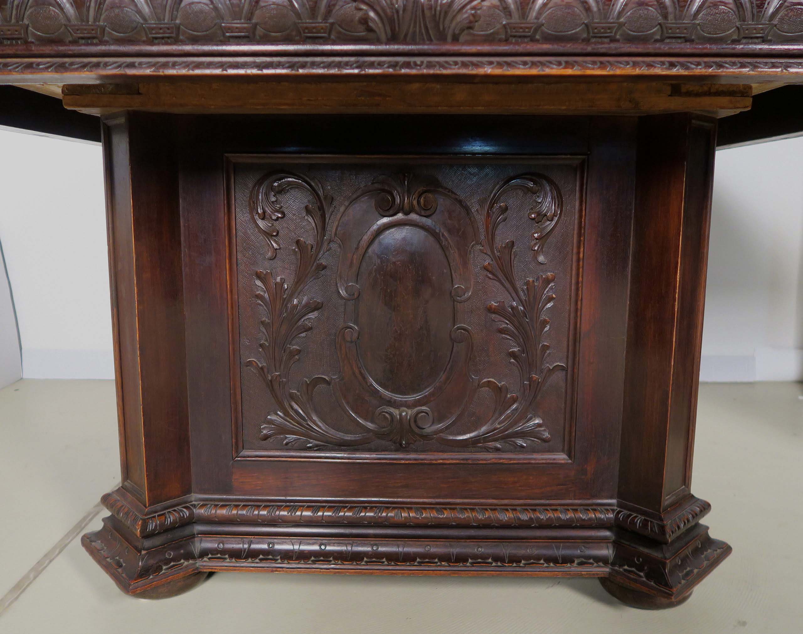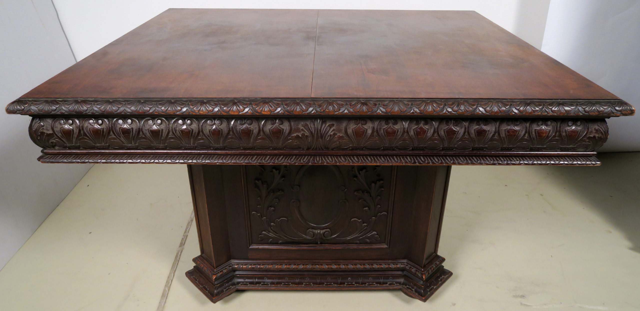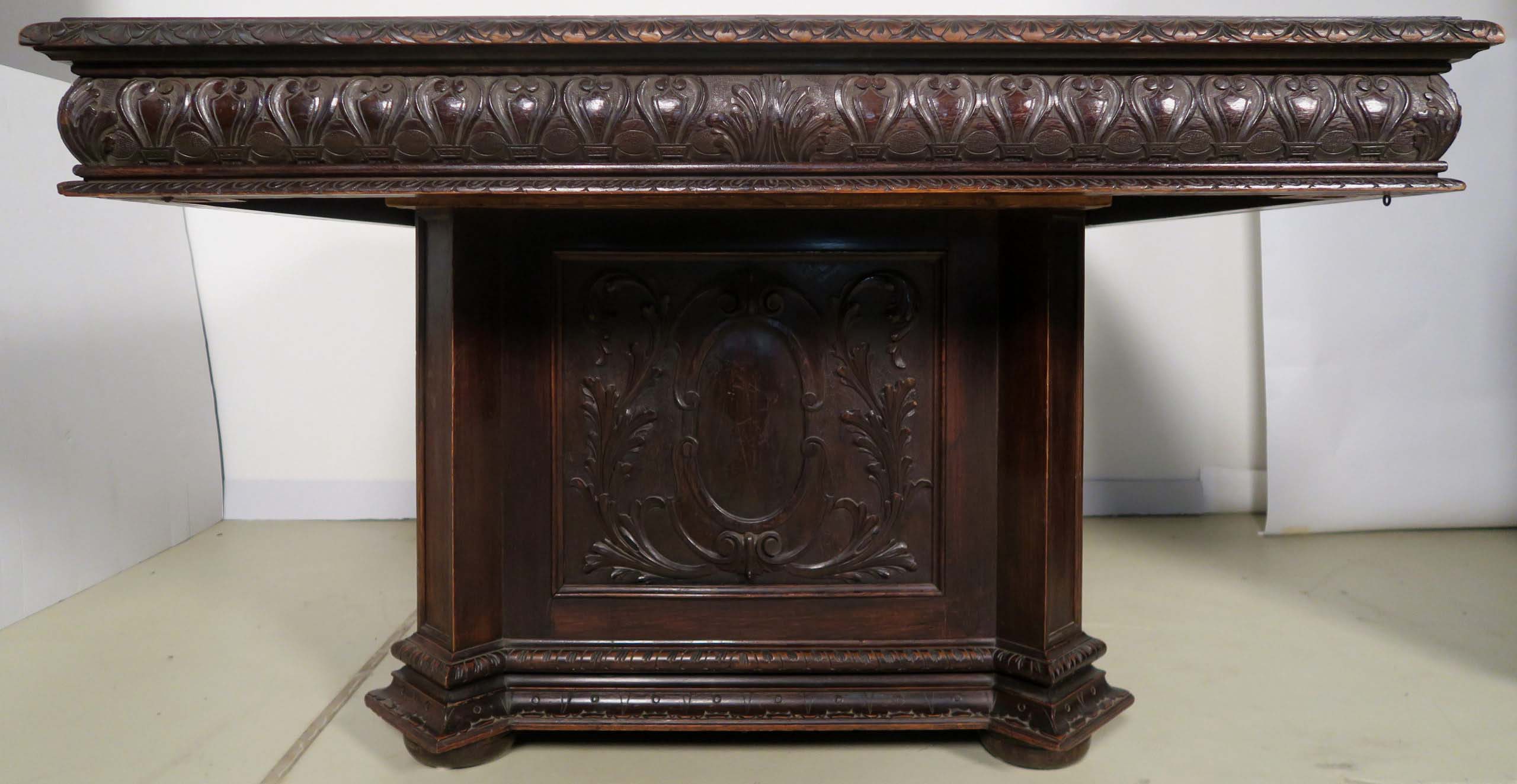 Auch der Esstisch nimmt die epochalen Stilmittel kunstvoll auf und begeistert durch seinen monumental gestalteten Fuß mit Kassettierungen mit wappenähnlichen Füllungen, den abgeschrägten Ecken und der rechteckigen Deckplatte mit breiter Zarge und intensivem Furnierbild.